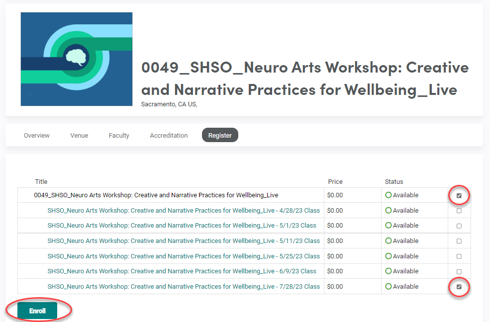 In order to advance in this course, you will need to select the overall course and specific class date that you wish to be shown on your transcript. This step is accomplished by placing a checkmark in the box next to the course (shown in black) and the correct tract (shown in teal) before clicking on "Enroll" as shown in the picture below.