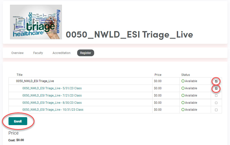 In order to advance in this course, you will need to select the overall course and specific class date that you wish to be shown on your transcript. This step is accomplished by placing a checkmark in the box next to the course (shown in black) and the correct tract (shown in teal) before clicking on "Enroll" as shown in the picture below.
