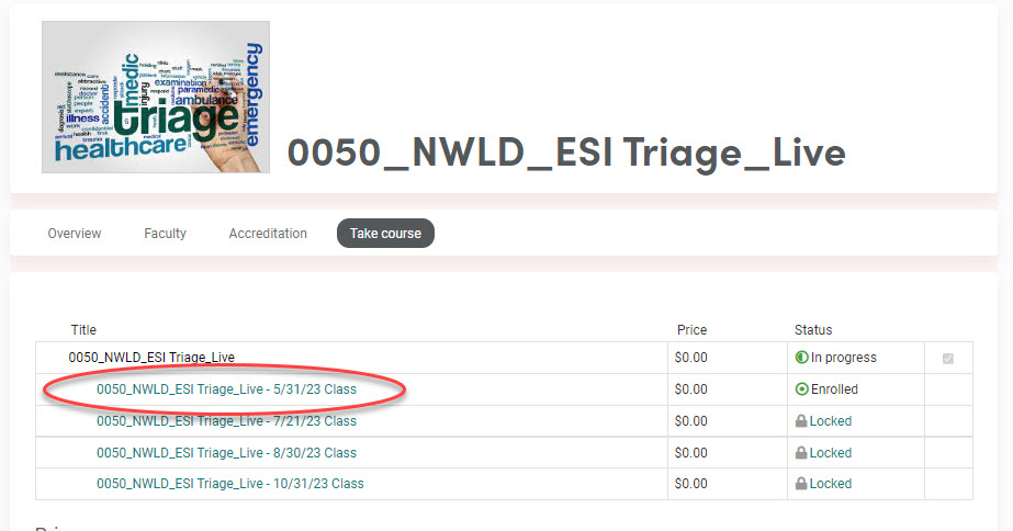 • 8/30/23 via Zoom 2pm-5pm (please select, "0050_NWLD_ESI Triage_Live - 8/30/23 Class" if you attended this class)