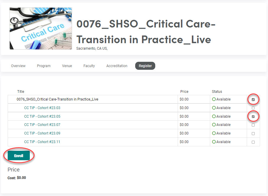 In order to advance in this course, you will need to select the overall course (firt line listed in black) and specific cohort number date that you wish to be shown on your transcript. This step is accomplished by placing a checkmark in the box next to the course (shown in black) and the correct cohort (shown in teal) before clicking on "Enroll" as shown in the picture below.