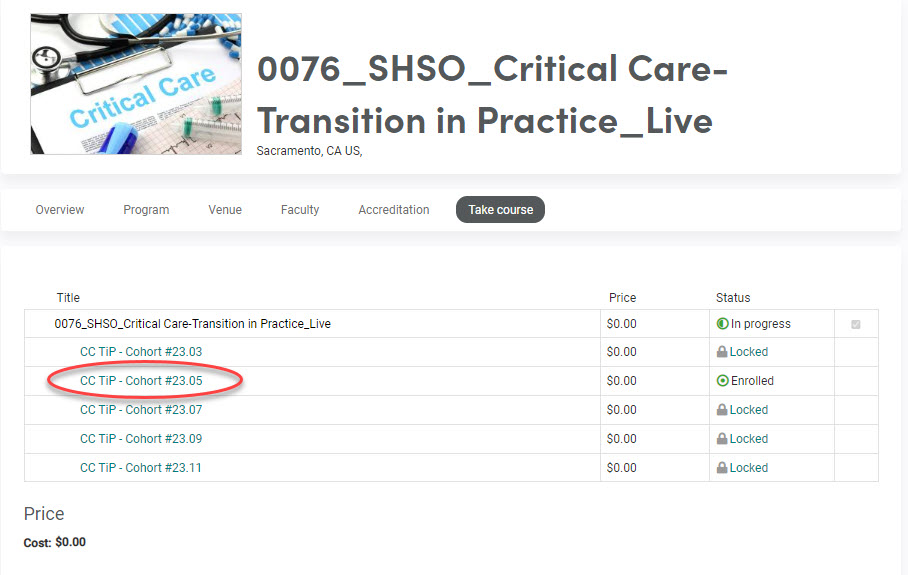 Next, click on the cohort title to reach the course, then click the Start button to launch the course outline.