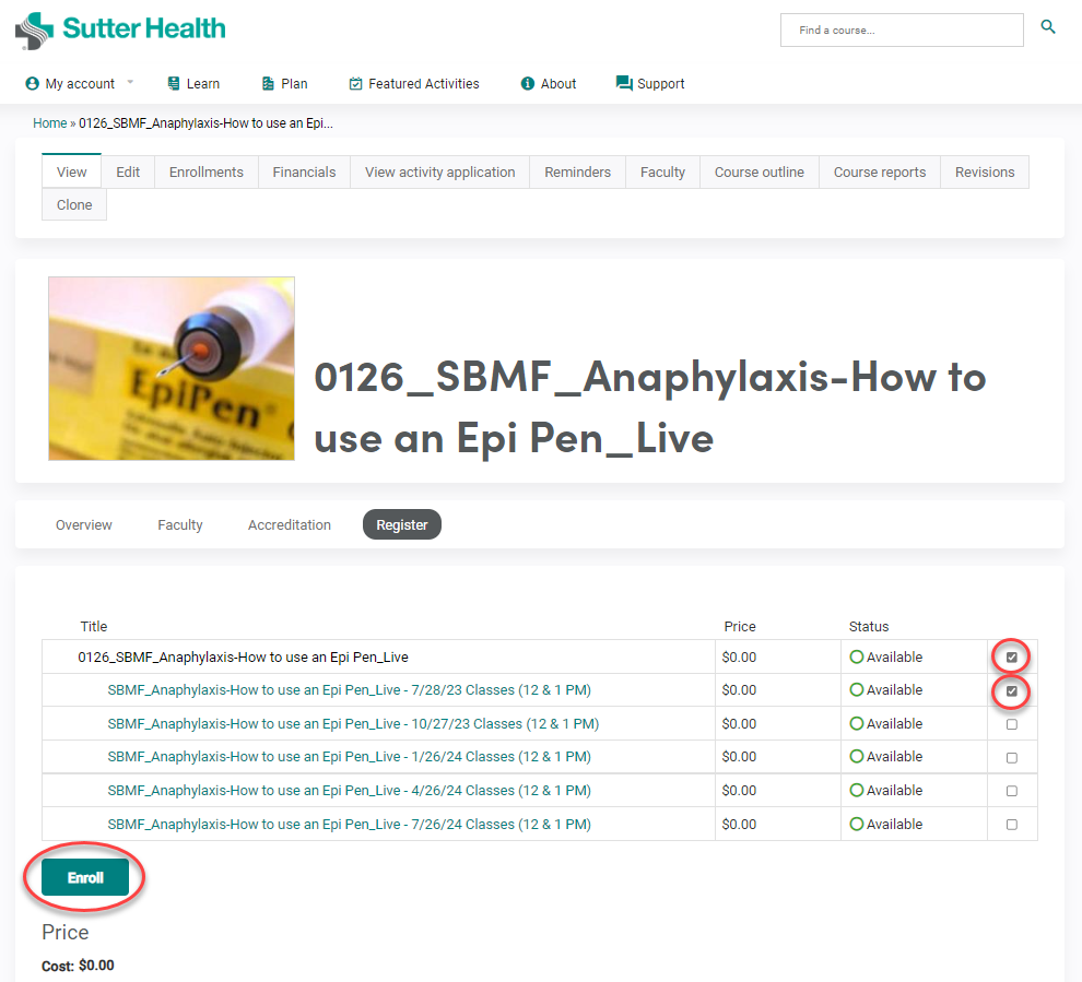In order to advance in this course, you will need to select the overall course and specific class date that you wish to be shown on your transcript. This step is accomplished by placing a checkmark in the box next to the course (shown in black) and the correct tract (shown in teal) before clicking on "Enroll" as shown in the picture below.