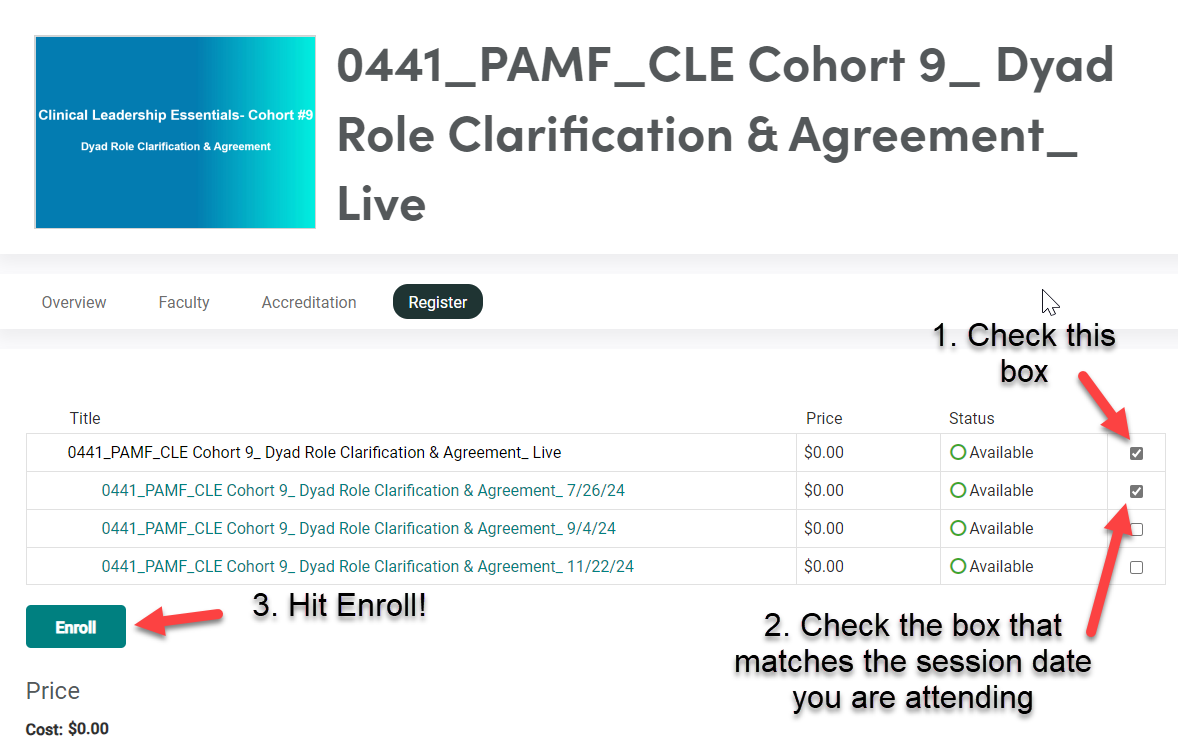 In order to advance in this course, you will need to select the overall course and specific class date that you wish to be shown on your transcript. This step is accomplished by placing a checkmark in the box next to the course (shown in black) and the correct tract (shown in teal) before clicking on "Enroll" as shown in the picture below.