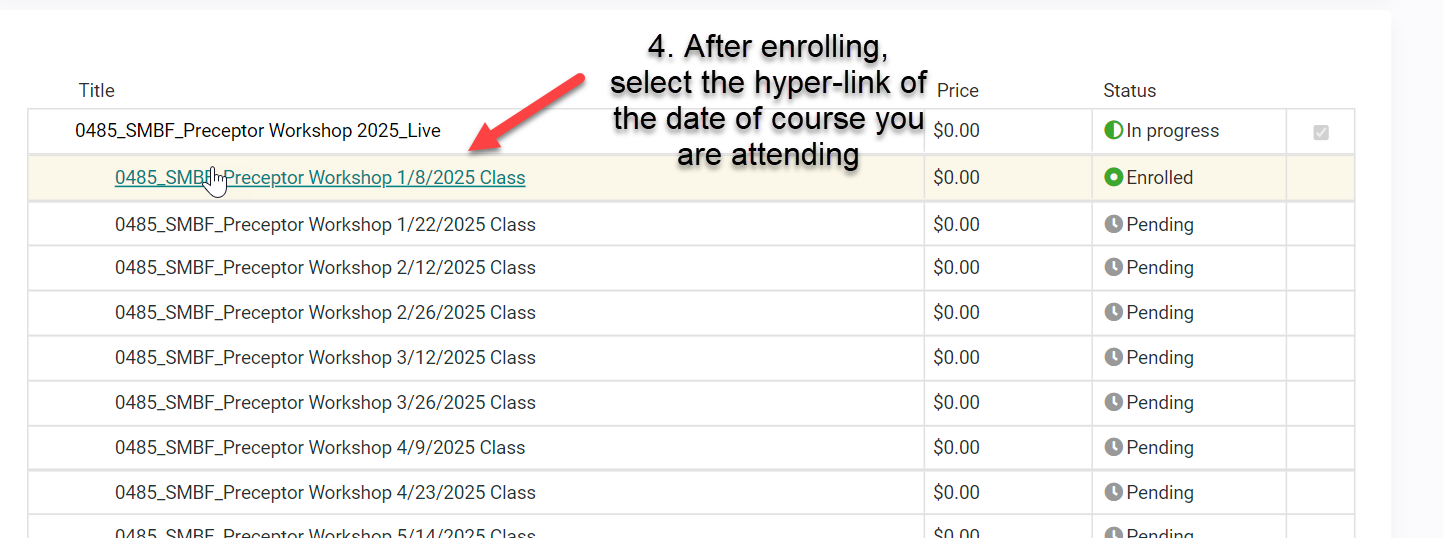 In order to advance in this course, you will need to select the parent course AND the child course/class date that you wish to be shown on your transcript. This step is accomplished by placing a checkmark in the box next to the parent course (shown in black) and the correct child course/class date (shown in teal) before clicking on "Enroll" as shown in the picture below.