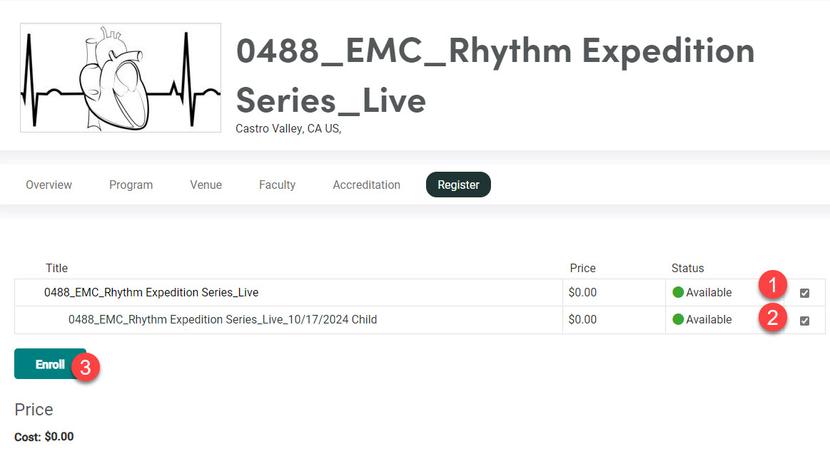 In order to advance in this course, you will need to select the overall course and specific class date that you wish to be shown on your transcript. This step is accomplished by placing a checkmark in the box next to the course (shown in black) and the correct tract (shown in teal) before clicking on "Enroll" as shown in the picture below.